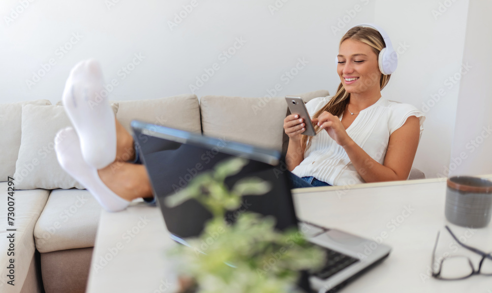 Cheerful businesswoman holding and using a phone while wearing headphones and listening to music working from home. One joyful woman using social media on her cellphone and enjoying a music break