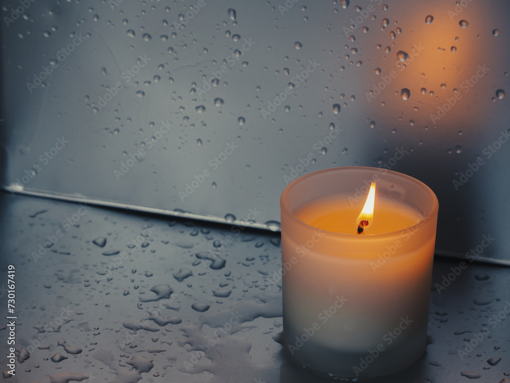 Scented candle on silver surface with water drops, peace and meditation concept.