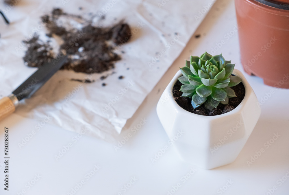 Repotting echeveria succulent plant at home. Houseplant hobby