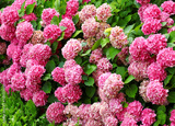 bush of numerous large hortension flowers of fuchsia and magenta in the garden of the villa