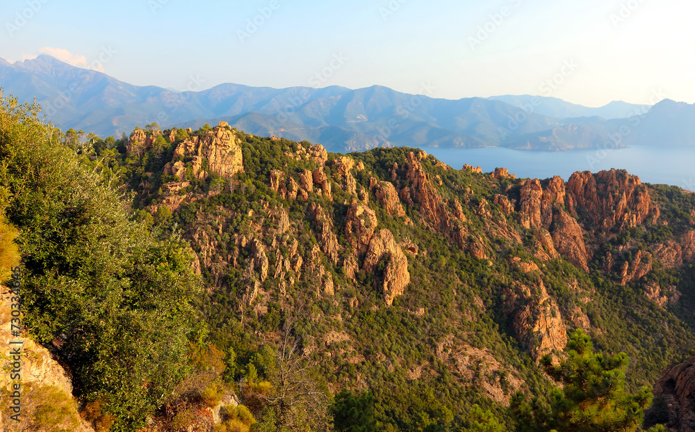 scenery of the red rocks called Badlands or Calanches in Corsica in France without people