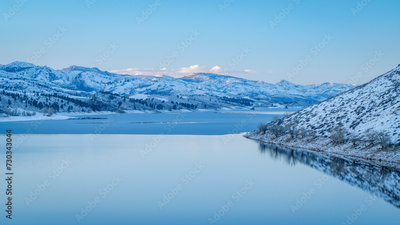 winter dusk over partially frozen Horsetooth Reservoir at foothills of northern Colorado