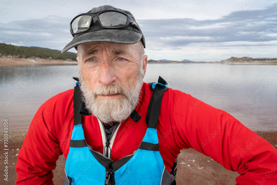 environmental portrait of a senior male paddler wearing drysuit and life jacket on a lake shore in Colorado winter