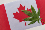 Fresh cannabis leaf and Big flag of Canada close up. Illegal cultivation and distribution. Medical use