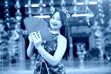 Portrait smiles Asian young woman wearing red cheongsam dress holding red envelopes decoration for Chinese new year festival celebrate culture of china at Chinese shrine Public places in Thailand