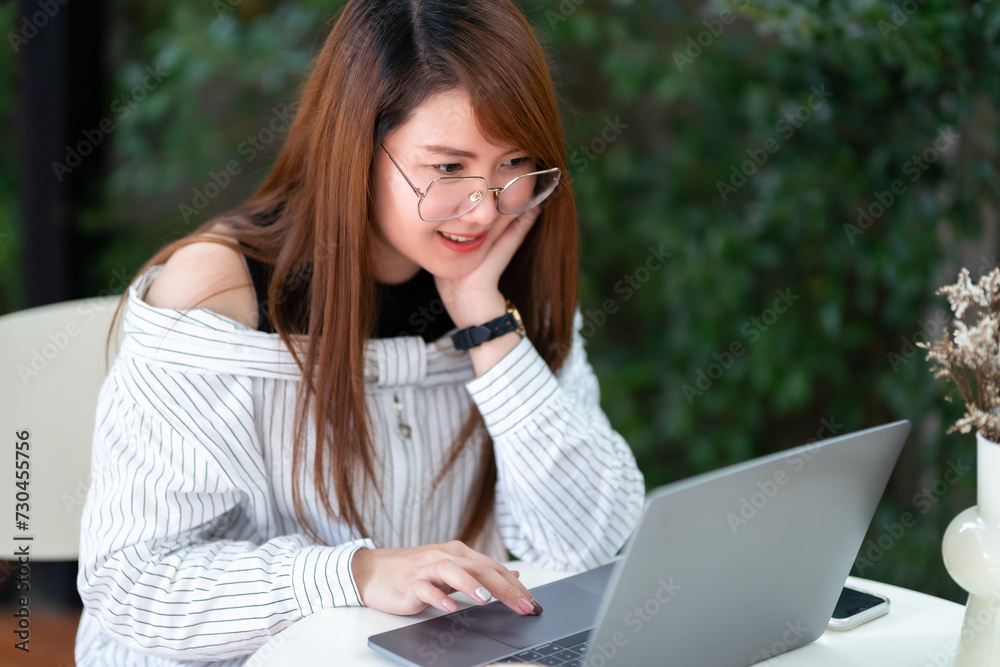 asian freelance people business female talking making using casual working with laptop computer for browsing internet, chatting and blogging and smartphone,notebook in coffee shop.