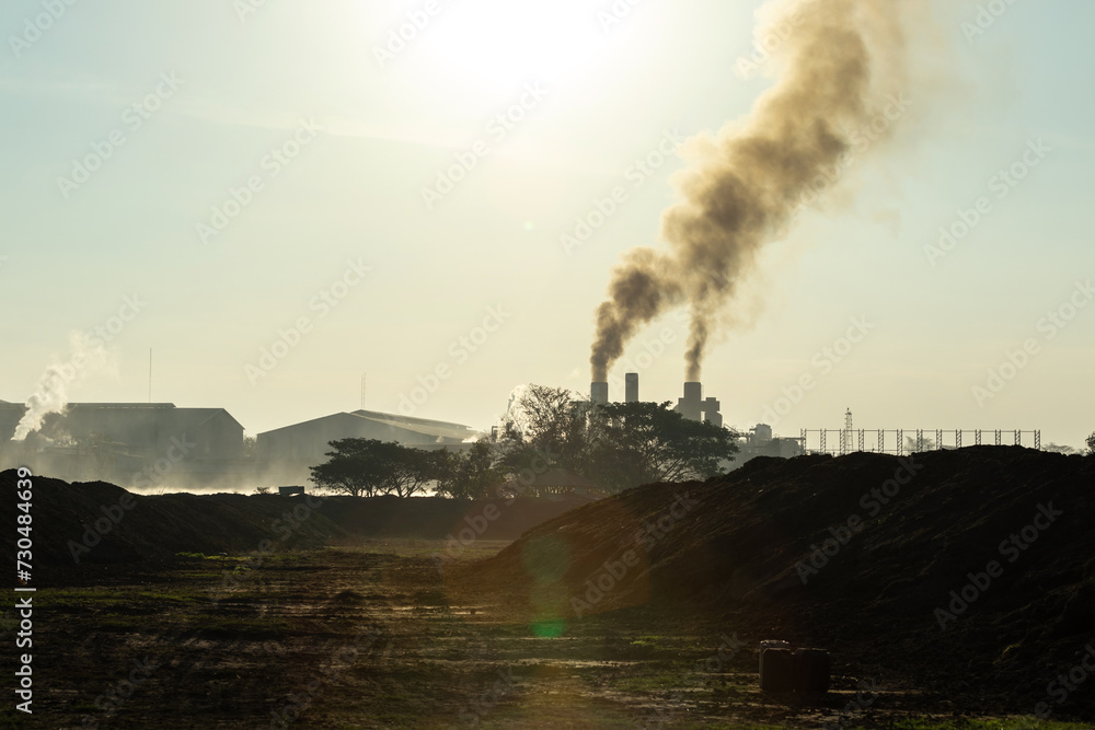 Black toxic smoke emissions from industrial plants, industrial waste contributing to air pollution. Sugar cane factory in Thailand