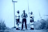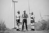 Team of wind turbine experts discussing clean energy production. Maintenance engineers working on wind farm