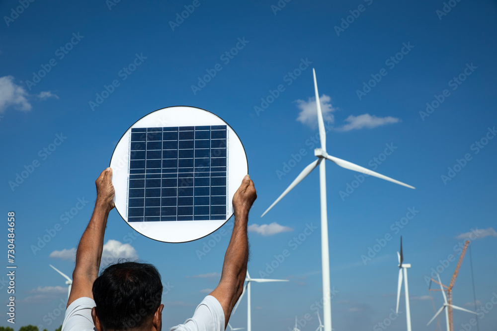 Elderly man's hand holding a solar panel in wind farm against a blue sky background. Clean renewable energy for the future