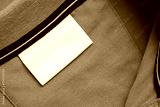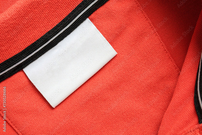 Blank white laundry care clothes label on orange shirt fabric texture background