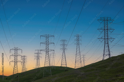 High Voltage Power Lines at the Crack of Dawn. Mission Peak Regional Preserve, Alameda County, California, USA.
