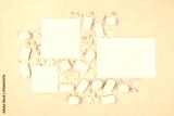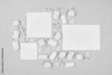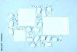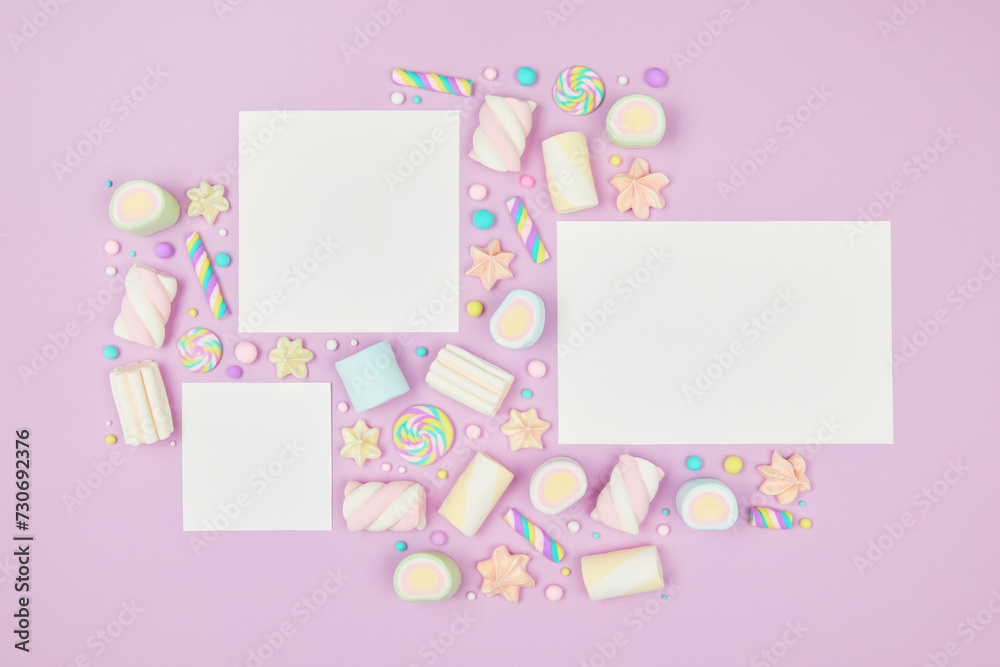 Set of three blank white cards on cute pastel purple kawaii background with frame of sweet candies, meringue and marshmallows . Flat lay, top view, copy space. Beautiful childlike design template