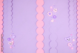 Trendy pastel purple kawaii banner background design template with cute air plasticine handmade cartoon animals, flowers, stars pattern. Top view, flat lay, copy space. Candycore, fairycore