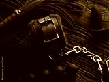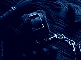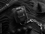 Red handcuffs and accessories for BDSM role play game over black wooden background
