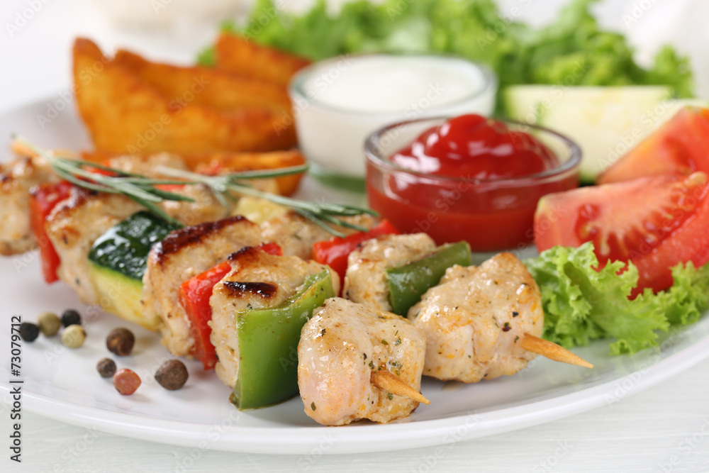 Fleischspieß Gericht mit Kartoffeln, Gemüse und Salat
