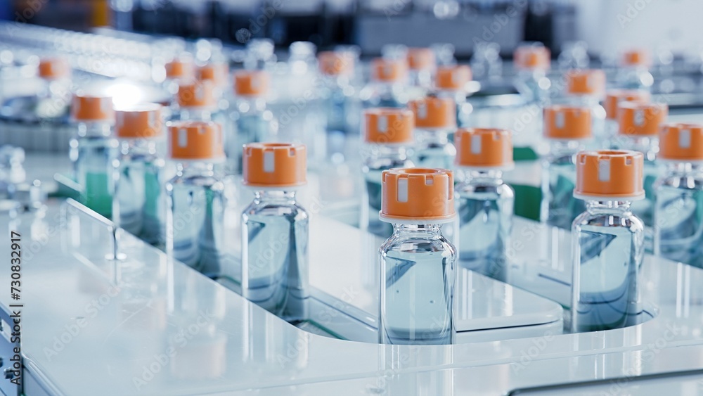 Close-up of Glass Vials on Conveyor Belt at Vaccine Production Facility. Medication Manufacturing Process. Medical Ampoule Production Line at Modern Pharmaceutical Factory