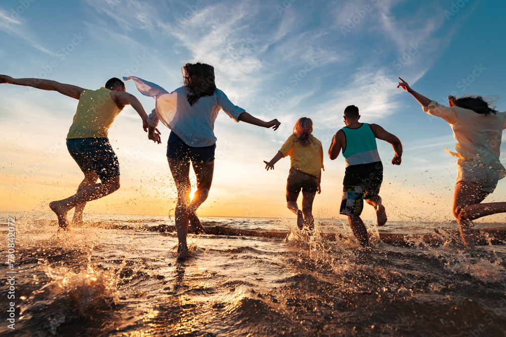 Group of happy young friends are having fun, runs and jumps at sunset beach with lots of splashes