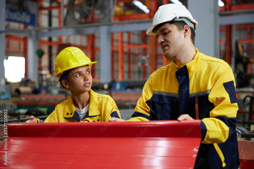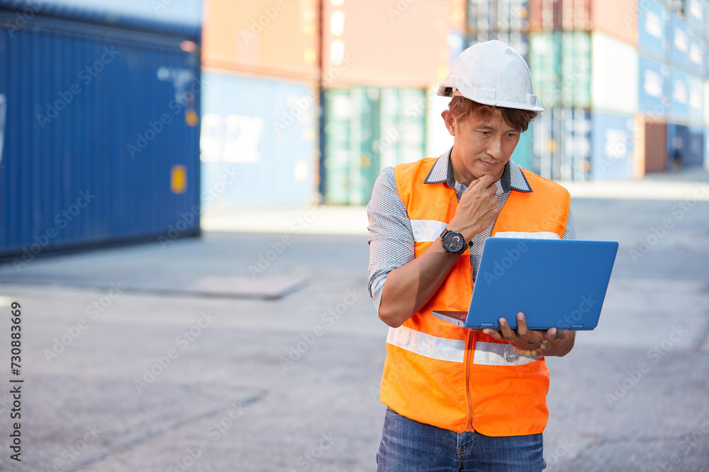 factory worker or engineer working on laptop computer in containers warehouse storage