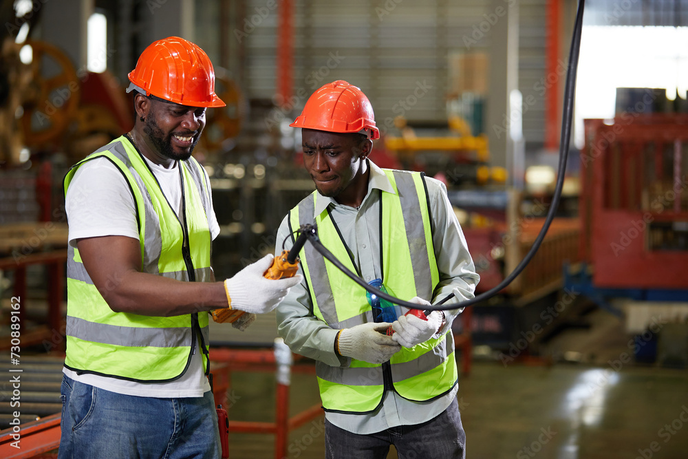 factory workers or engineers operating remote switch to control machine in the factory