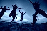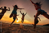 Big group of happy young friends are having fun and jumps at sunset sea beach. Silhouettes of tourists runs to swim