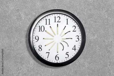 Clock dial with burnt and whole matches inside on a wall. The concept of emotional burnout during the working day.