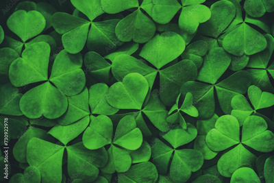 Background with green clover leaves for Saint Patrick's day. Abstract pattern with a shamrock. Spingtime nature. Vintage film aesthetic.