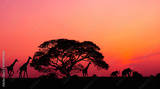 Amazing sunset and sunrise.Panorama silhouette tree on africa.Dark tree on open field dramatic sunrise.Safari theme.Giraffes.