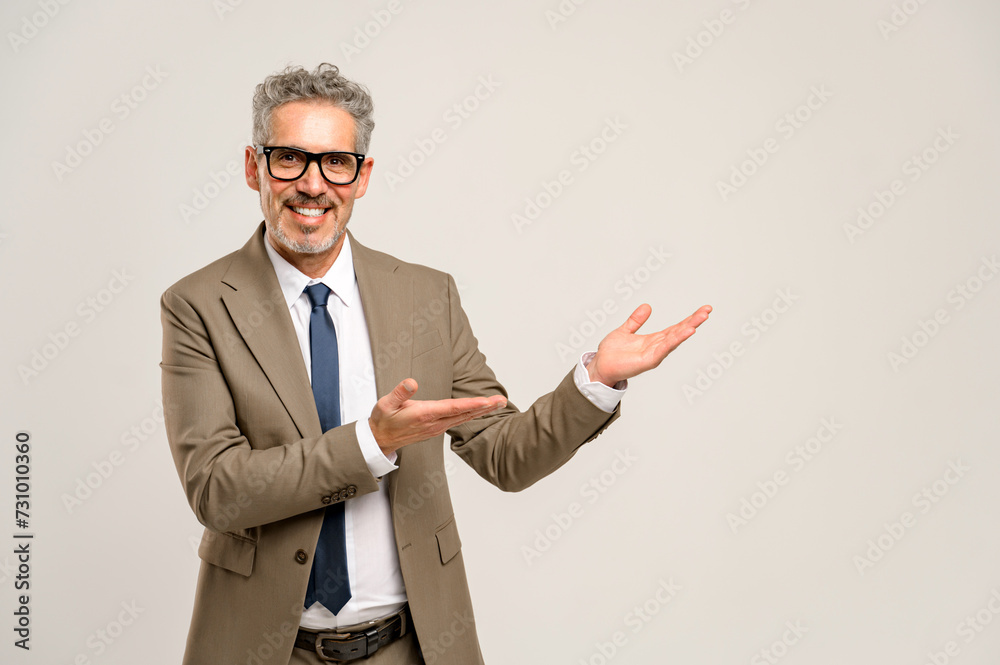 Senior businessman pointing openly with both hands as if presenting new ideas or a concept, illustrating openness and readiness to innovate in the corporate environment. Advertising concept, copyspace