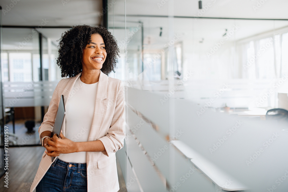Charming smiling African-American young businesswoman in smart casual beams with friendly smile, her laptop in hand, showcasing a welcoming workplace atmosphere. Female office employee carrying laptop