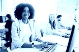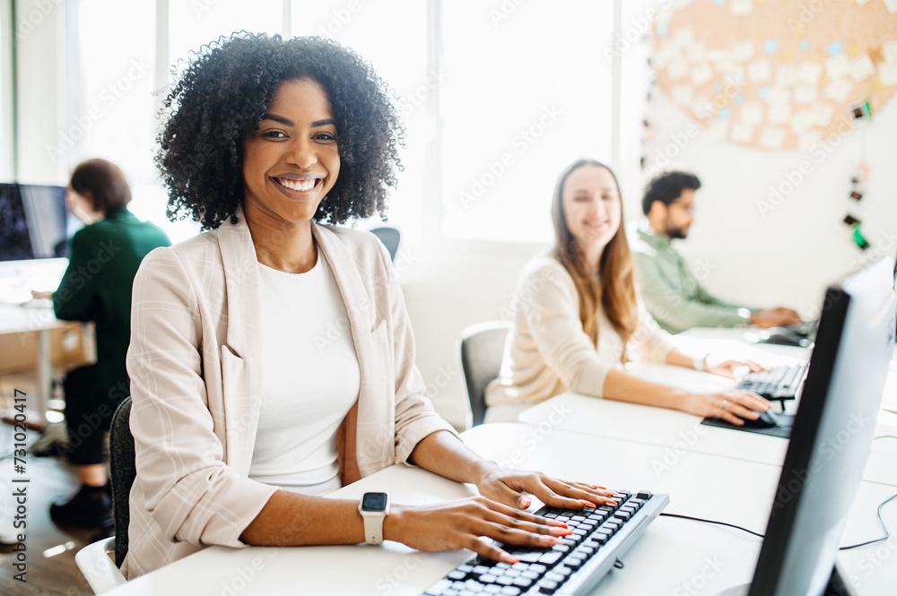 A cheerful female employee with curly hair radiates positivity, as she engages with her work on a desktop computer in an open space office, demonstrating a productive and friendly workplace ambiance