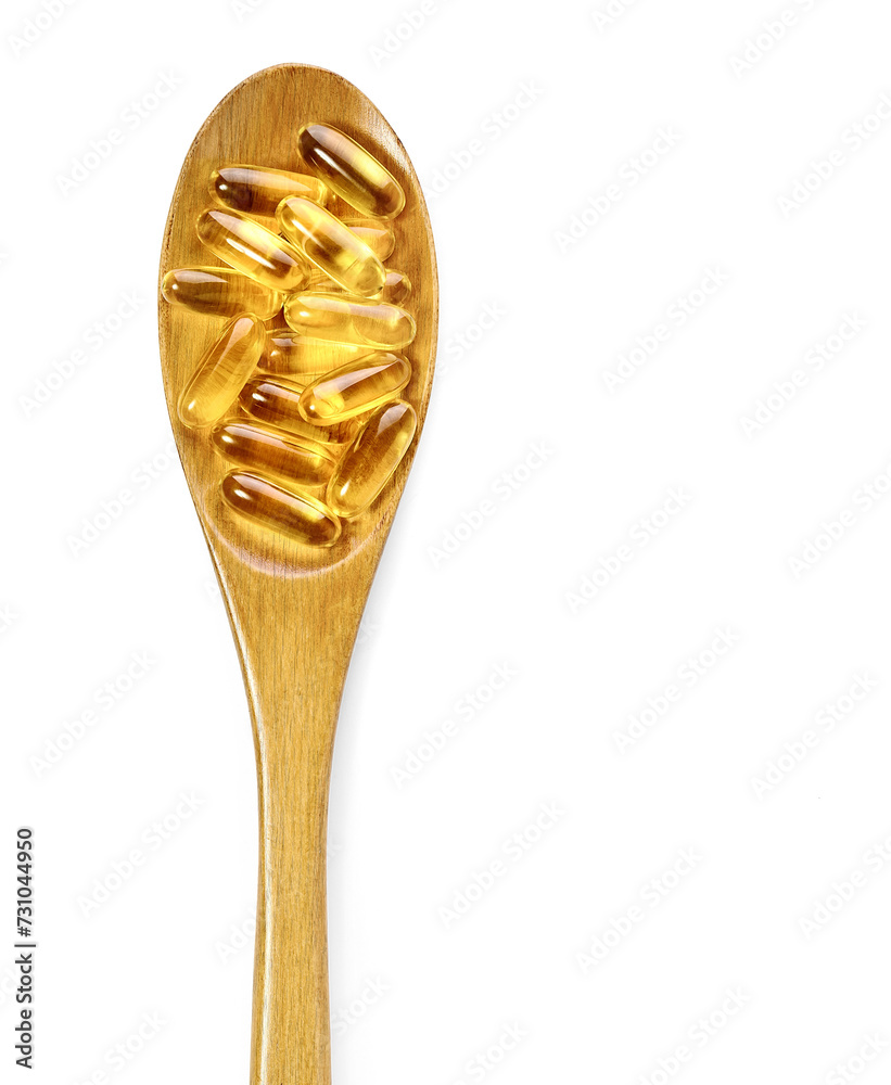 Omega 3 cod liver oil capsules in the wooden spoon on white background