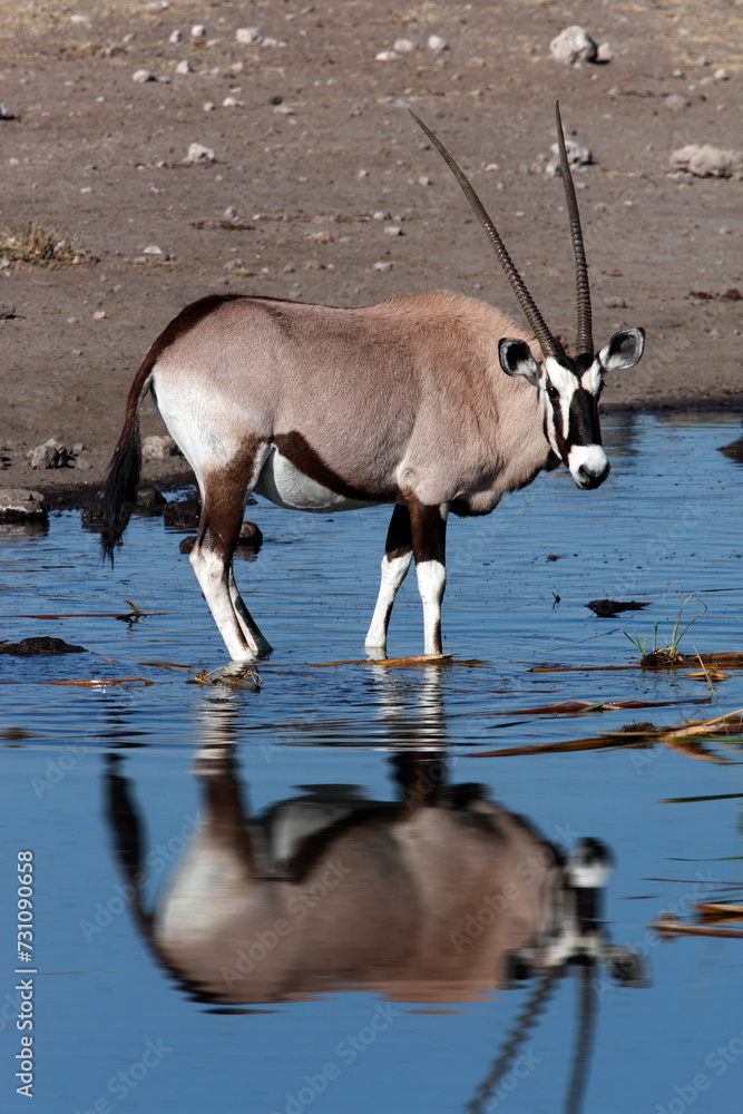 Gemsbok antelope (Oryx) at a waterhole in Etosha, Namibia.