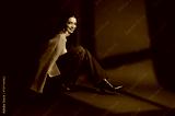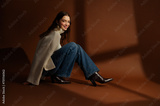 Fashionable happy smiling woman wearing oversized white sweater, wide leg jeans, leather cowboy boots, posing on brown background. Full-length studio fashion portrait. Copy, empty blank space for text