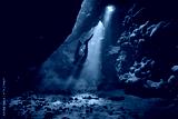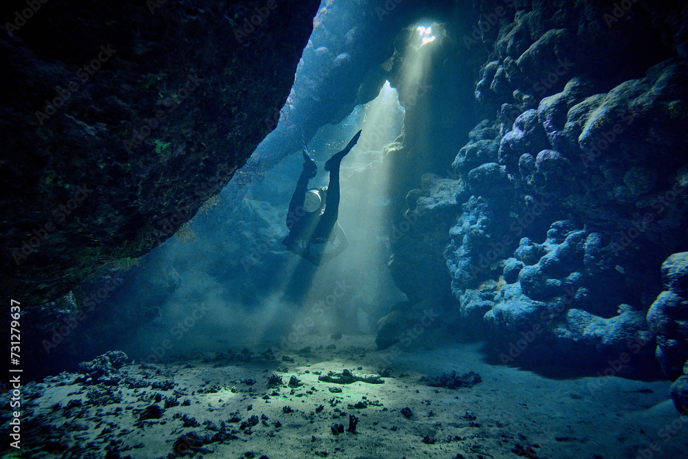 The beauty of the underwater world - beautiful space of underwater cave with rays of natural sunlight - scuba diving in the Red Sea, Egypt