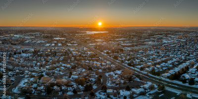 winter sunrise over city of Fort Collins and plains in northern Colorado, aerial panorama
