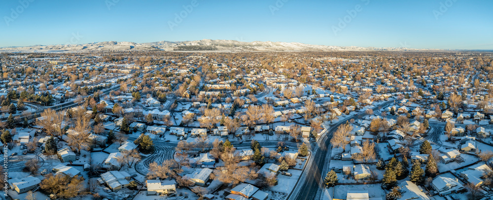 winter morning over city of Fort Collins and Front Range of Rocky Mountains in northern Colorado, aerial panorama