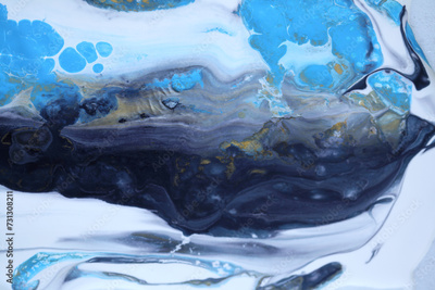 Acrylic pour flow painting blue colors blots. Marble texture. Abstract background.