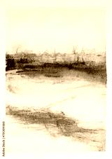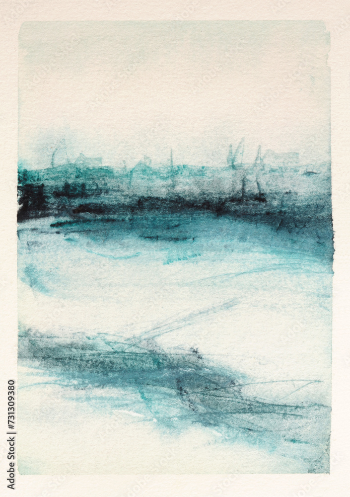Ink watercolor hand drawn smoke flow stain blot landscape on wet grain paper texture background. Beige, blue colors.