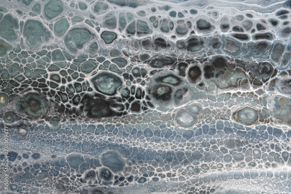 Acrylic pour flow painting blue, black, white colors blots. Marble texture. Abstract background.