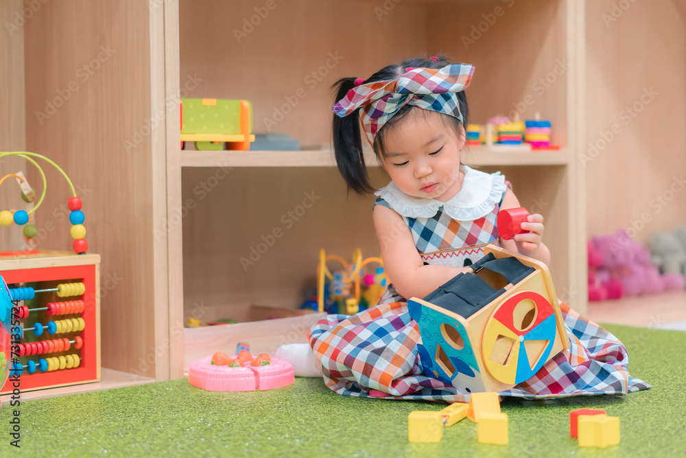 Asian girl play education toy at kindergarten preschool. Development chlidhood.
