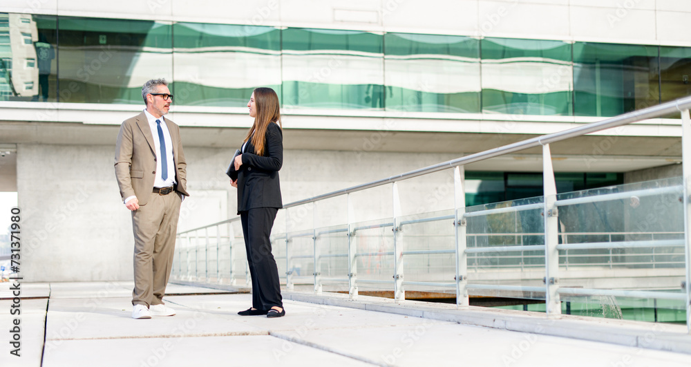 A confident senior businessman in a smart suit conversing with a young professional woman in a modern urban setting, highlighting a professional exchange between different generation, wide banner