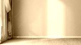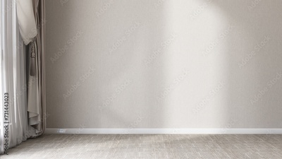 Gray white wallpaper wall empty room in sunlight from curtain drape window, blackout, sheer curtain on beige carpet floor for luxury, minimal interior design decoration product background 3D
