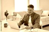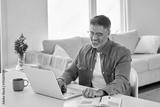 Smiling happy older mature middle aged professional man wearing eyeglasses looking at computer sitting at living room table, using laptop hybrid working, elearning, browsing online at casual home.