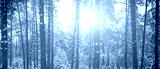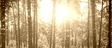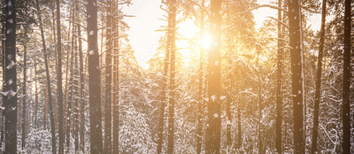 Sunset or sunrise in the winter pine forest covered with a snow. Sunbeams shining through the pine trunks. Vintage film aesthetic.
