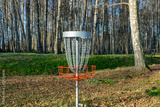 a disc golf hole on green grass with birch grove in background, disc golf basket in a park