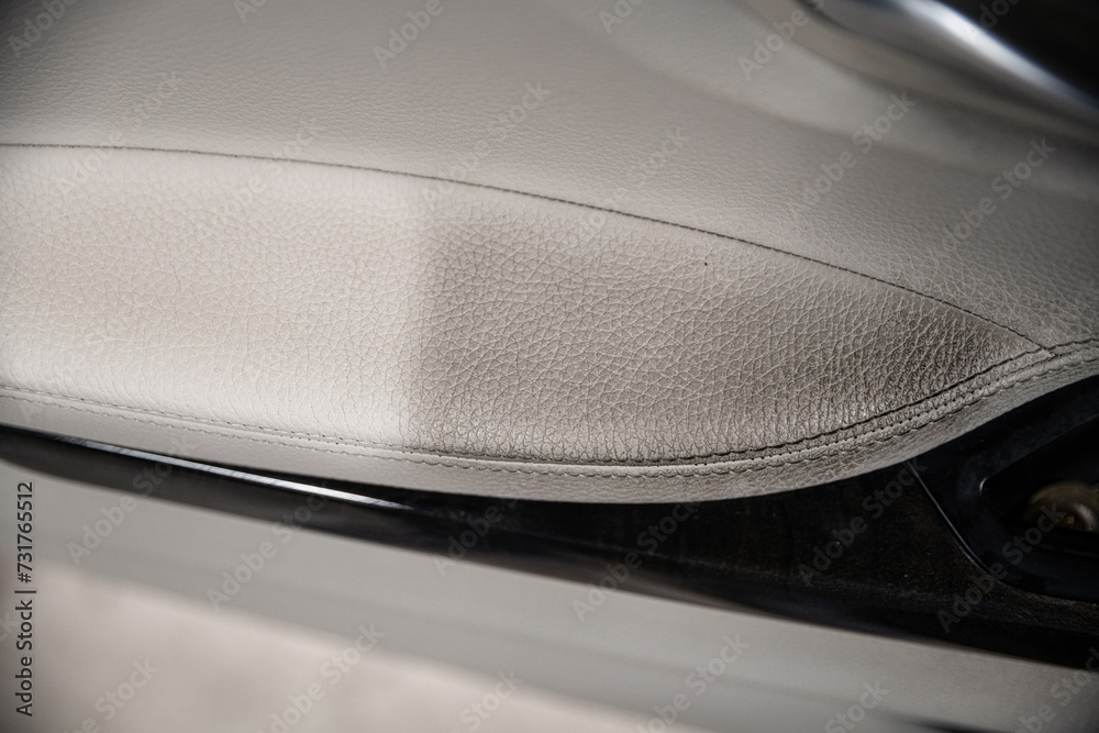 Before and after effect cleaning leather car upholstery in car detailing studio