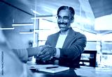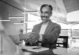 Happy mature business man recruiter hr manager and recruit handshake at job interview. Smiling middle aged professional executive advisor and bank client shake hands at corporate office meeting.