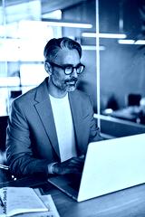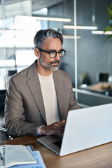 Busy mature business man, middle aged professional ceo executive, serious older entrepreneur investor looking at laptop computer technology thinking on question working in office at desk. Vertical.