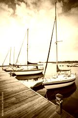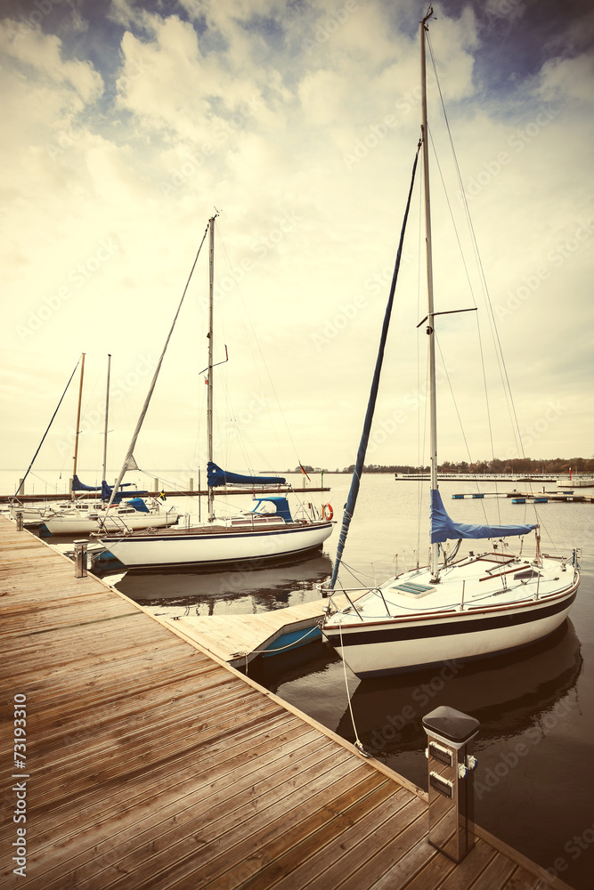 Retro filtered picture of yachts at wooden lake bridge, Stepnica, Poland.