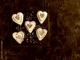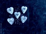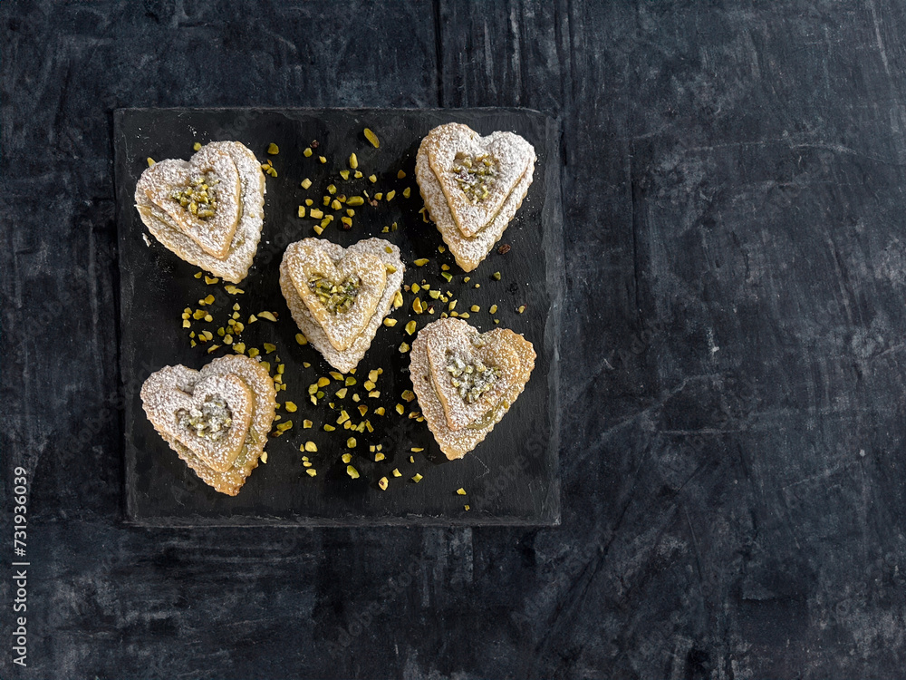 Valentine's Day sweets in the shape of a heart with pistachio cream and icing sugar.